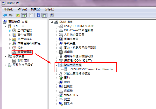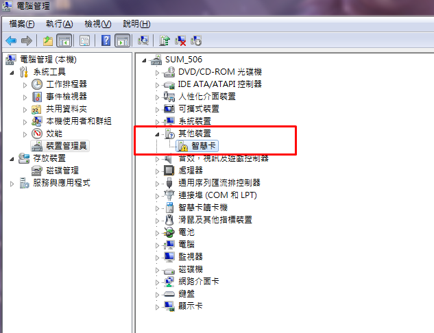 1.檢視「電腦」→ 電腦管理 → 裝置管理員 → 確認讀卡機狀態